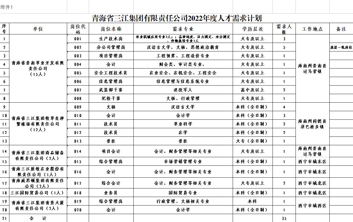 此次擬招聘20個崗位35人,具體內(nèi)容詳見附件1,即《青海省三江集團有限責任公司2022年度人才需求計劃表》。