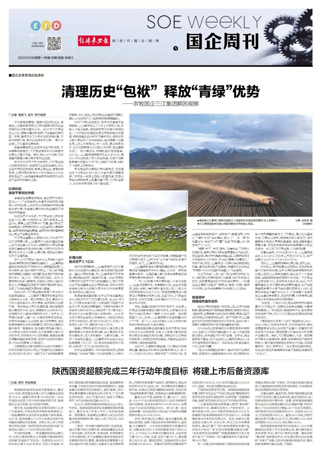日前,《經(jīng)濟(jì)參考報(bào)》刊發(fā)青海省三江集團(tuán)有限公司專版文章《清理歷史“包袱“ 釋放“青綠”——農(nóng)牧國企三江集團(tuán)解困觀察》,深入介紹省三江集團(tuán)抓住國企改革三年行動(dòng)契機(jī),三江集團(tuán)通過加強(qiáng)頂層設(shè)計(jì),完善現(xiàn)代企業(yè)制度建設(shè),優(yōu)化企業(yè)布局和經(jīng)濟(jì)結(jié)構(gòu),聚焦主責(zé)主業(yè),清理包袱負(fù)擔(dān),作為國家級(jí)農(nóng)牧業(yè)產(chǎn)業(yè)化發(fā)展龍頭企業(yè)逐漸走出了一條構(gòu)建具有高原特色的現(xiàn)代農(nóng)牧業(yè)產(chǎn)業(yè)體系的革新之路。敬請(qǐng)關(guān)注。