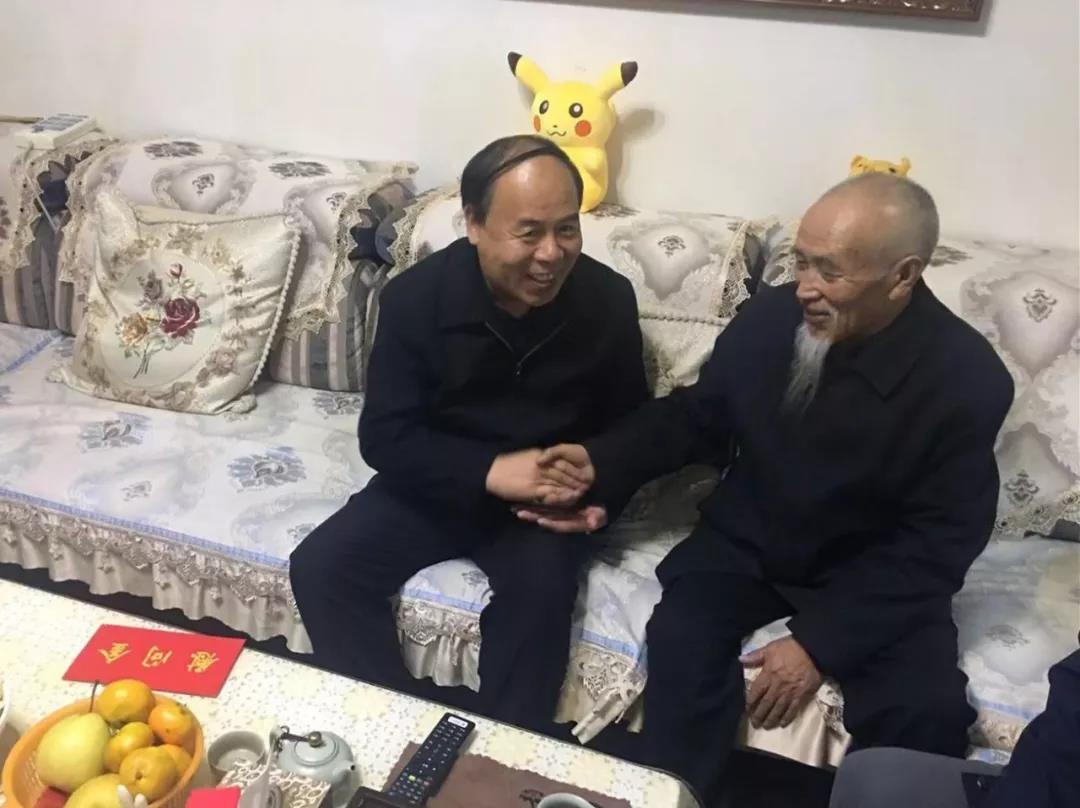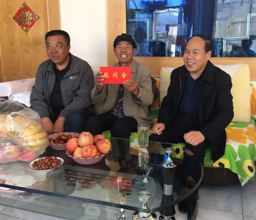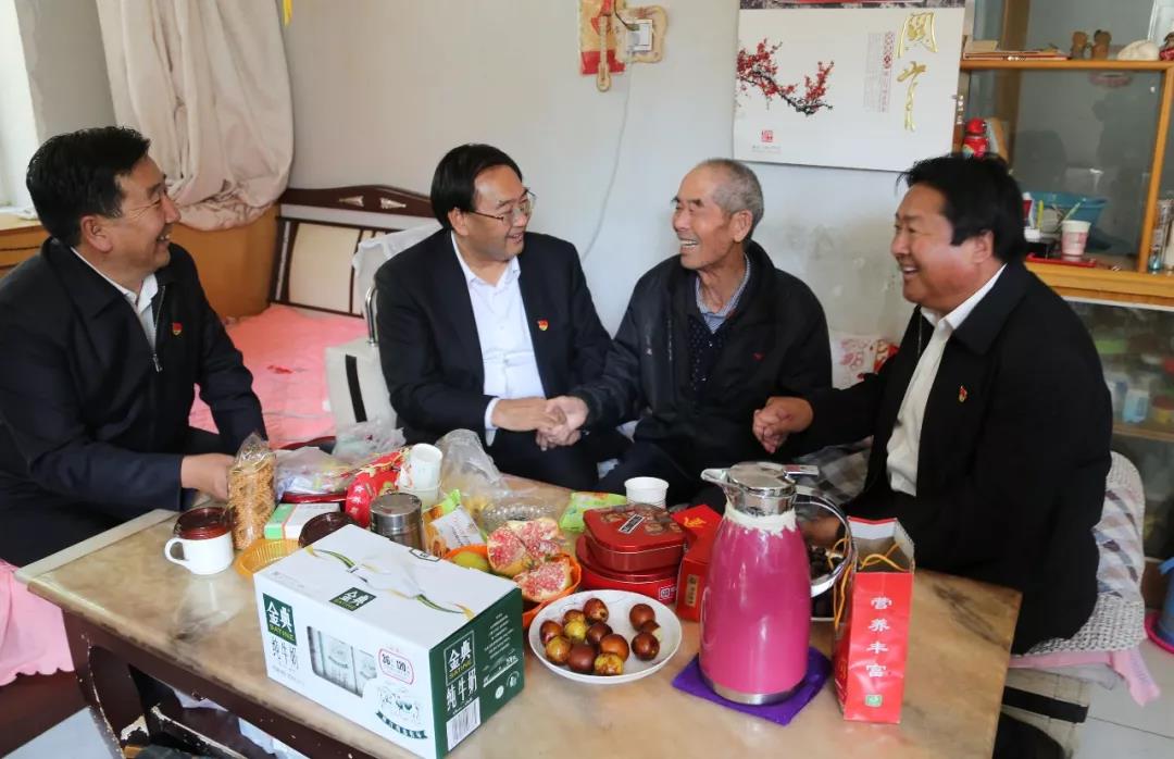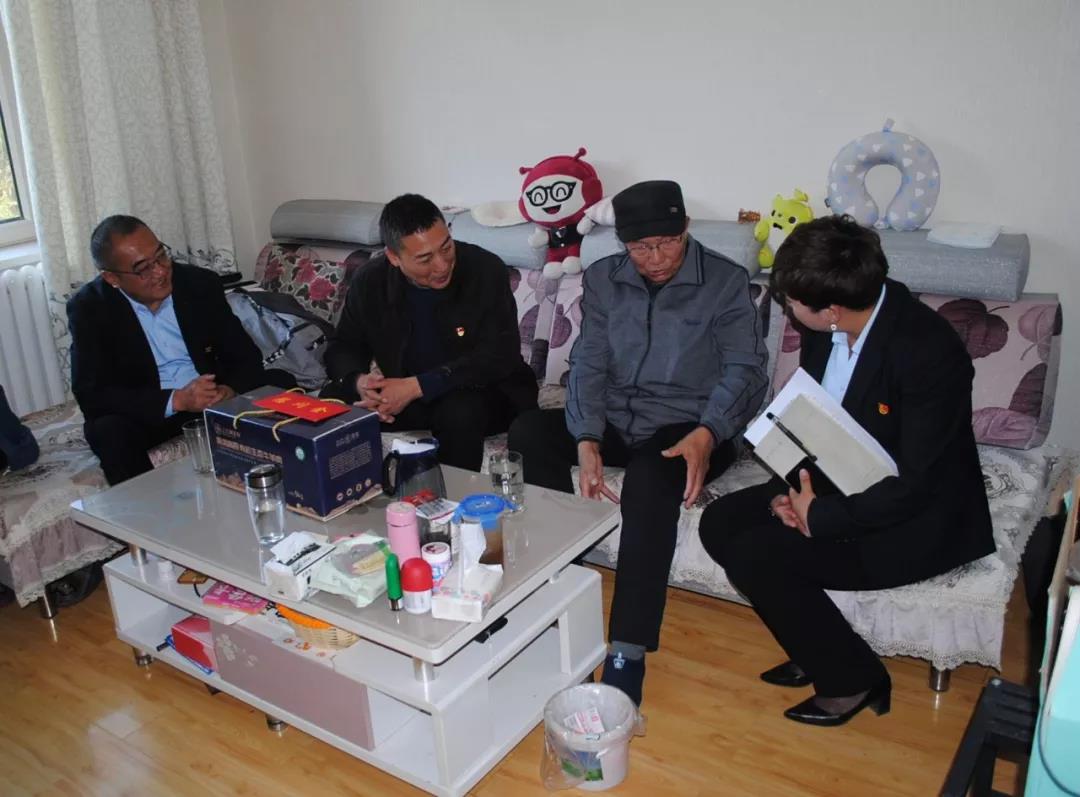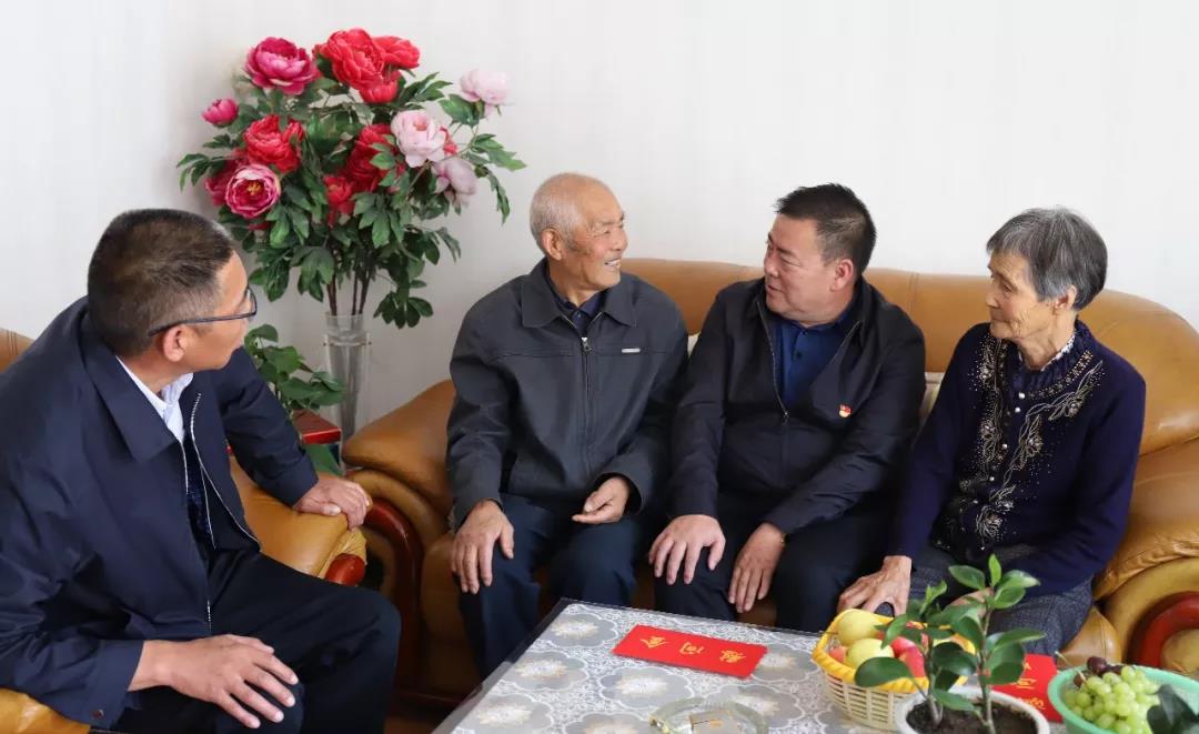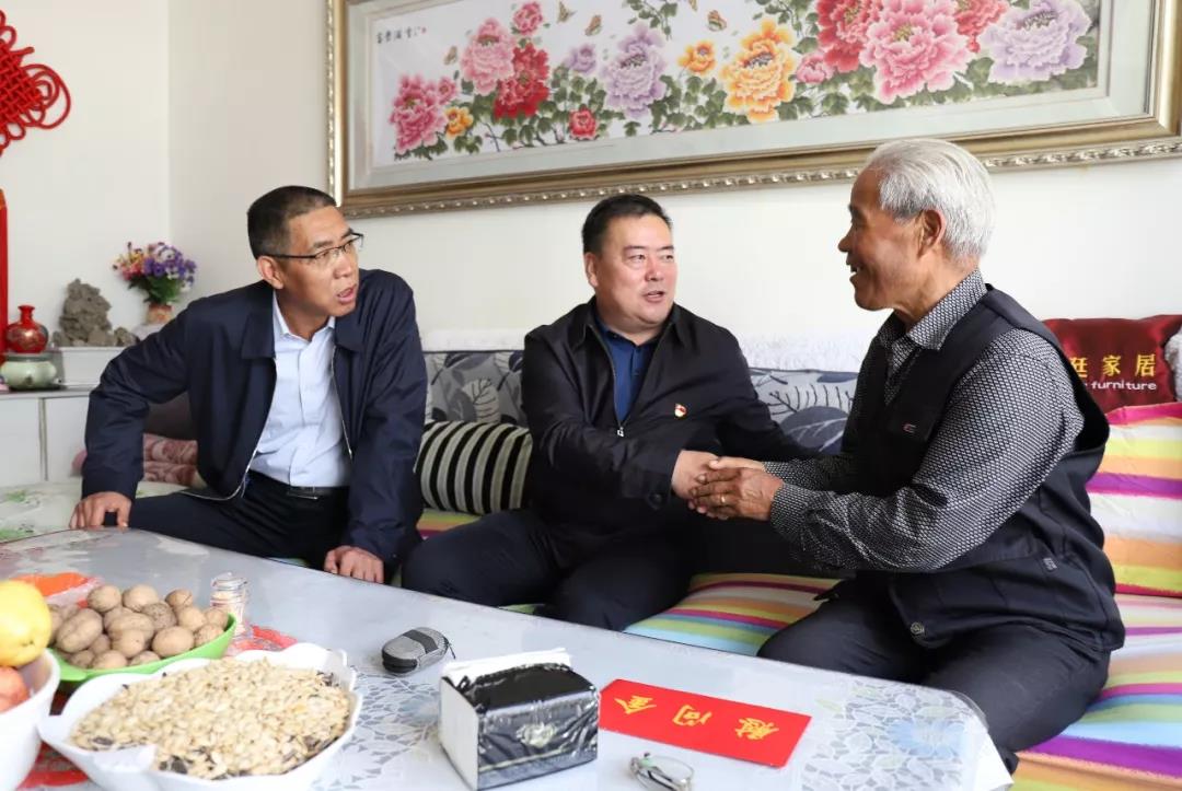 圖為集團(tuán)公司黨委副書記祁生珠到青墾大廈退休老黨員曹積占家中走訪慰問(wèn)。